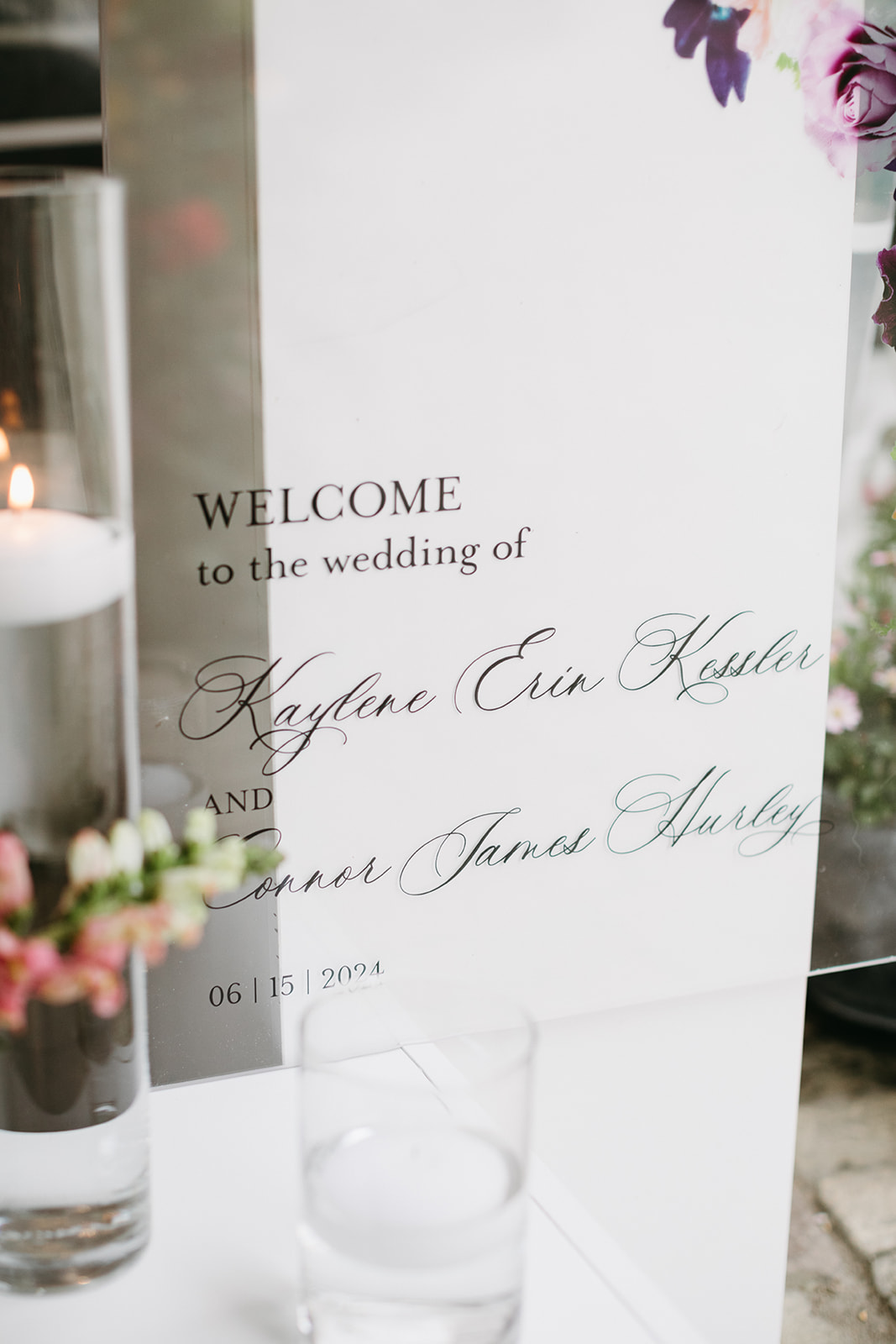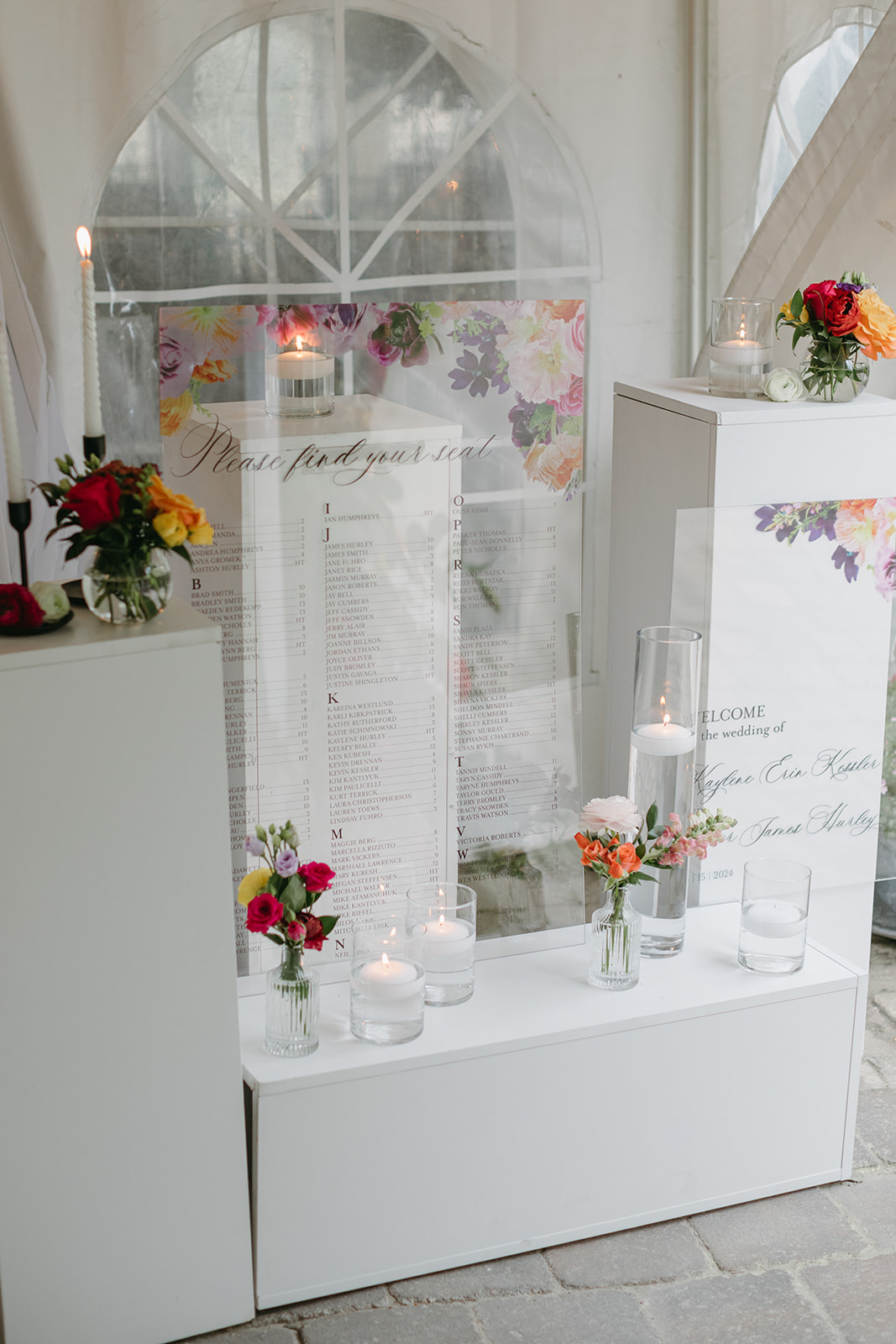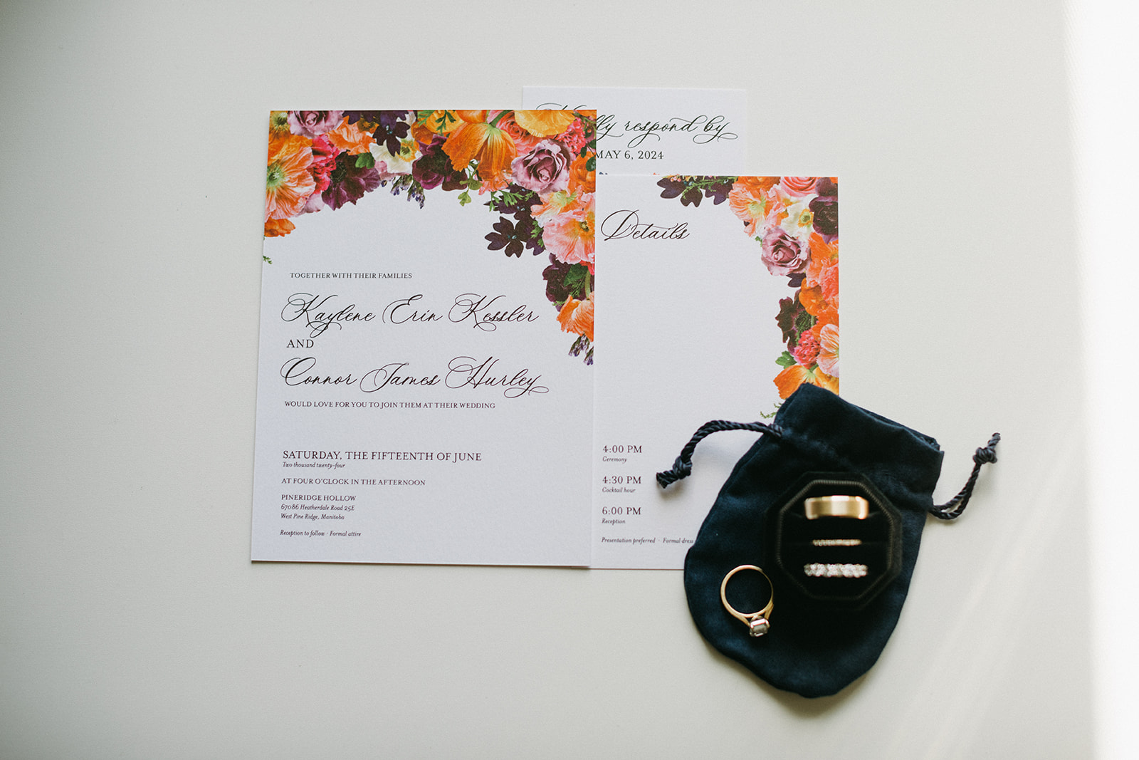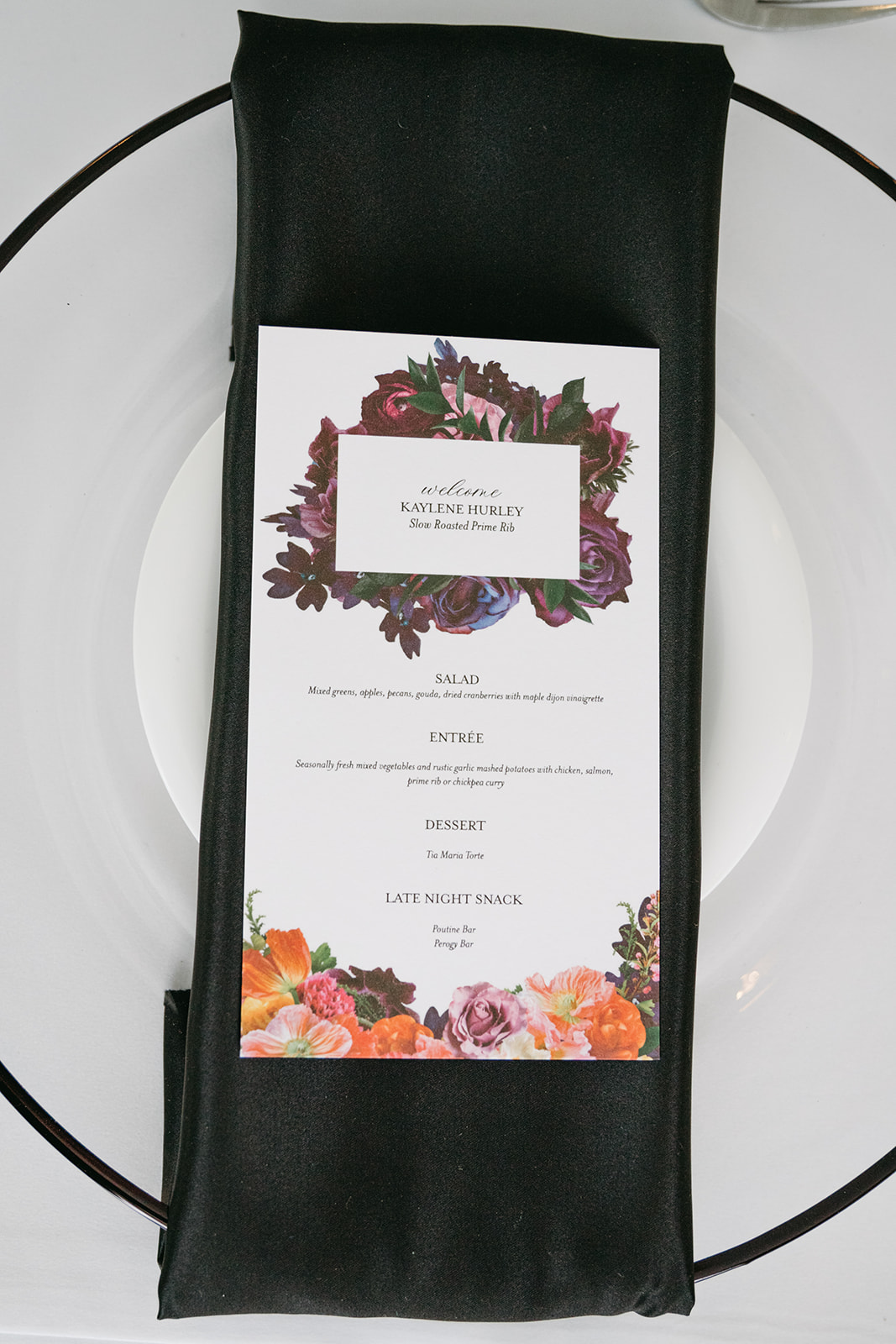 We were so thrilled to design a full wedding invitation suite and day-of signage and table stationery that matched the energy of this wedding: bold florals, rich colour, and a warmth that carried through every single piece. Their wedding invitation suite was a three-piece design anchored in those signature blooms, a nod to the florals that would fill every corner of their celebration at Pineridge Hollow. Day-of, the stationery story continued with a full lineup of acrylic signage: a welcome sign, seating chart, bar signs, and table numbers that brought cohesion to the venue and kept things feeling intentional throughout the evening. The menus were one of those details guests actually noticed. Each one was personalized with guest names, and the floral details were colour-coded by meal selection, a thoughtful touch that made service seamless for the catering team and felt elegant to every person seated.