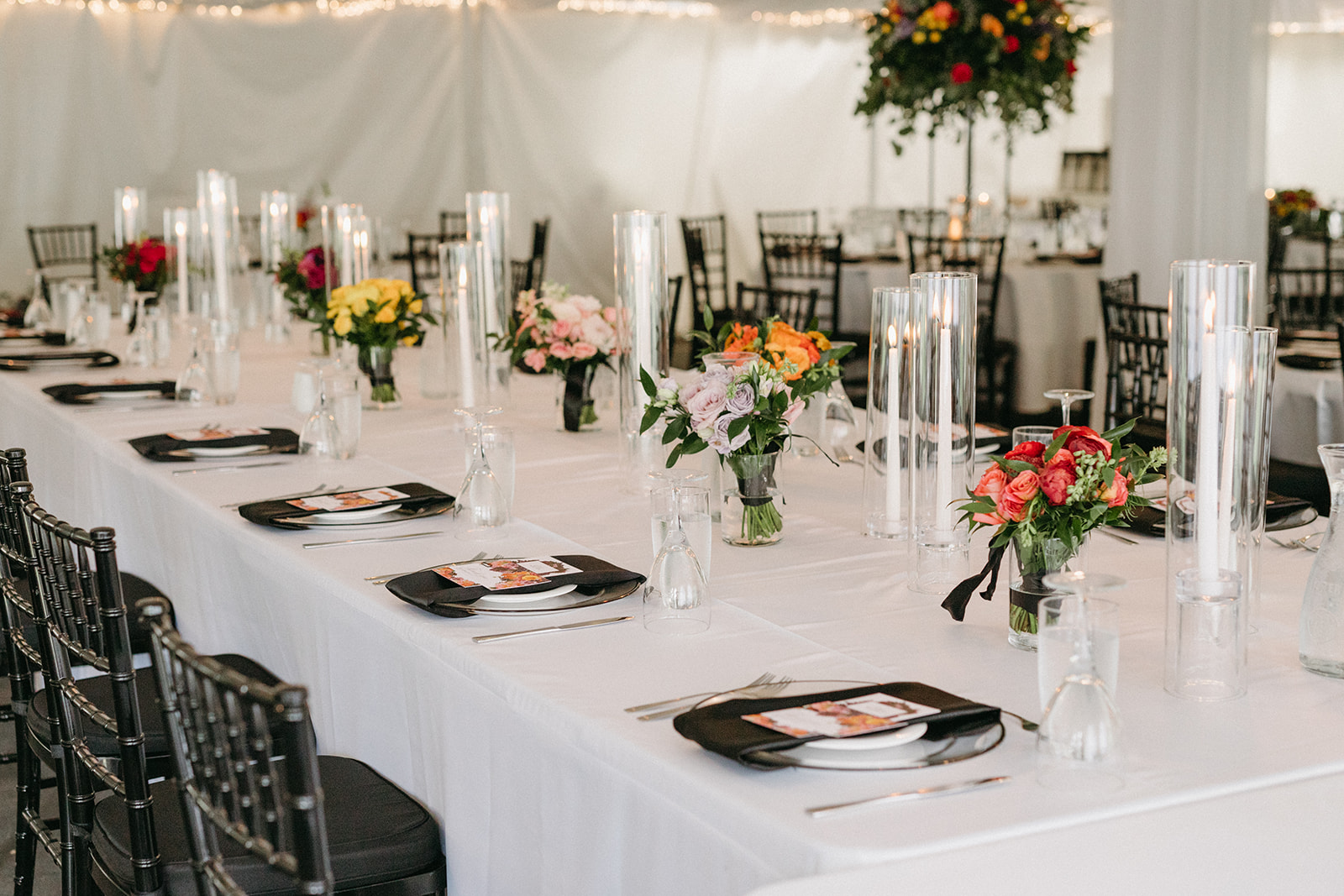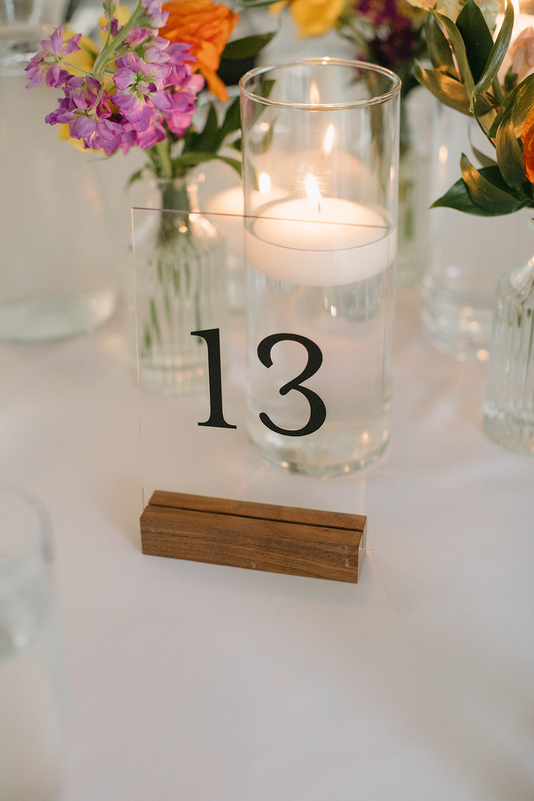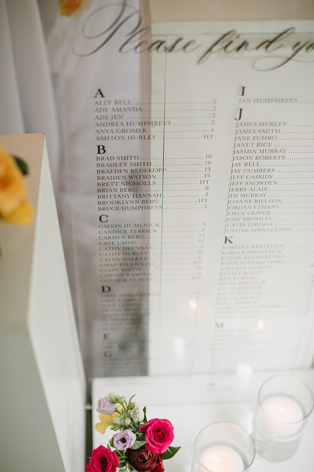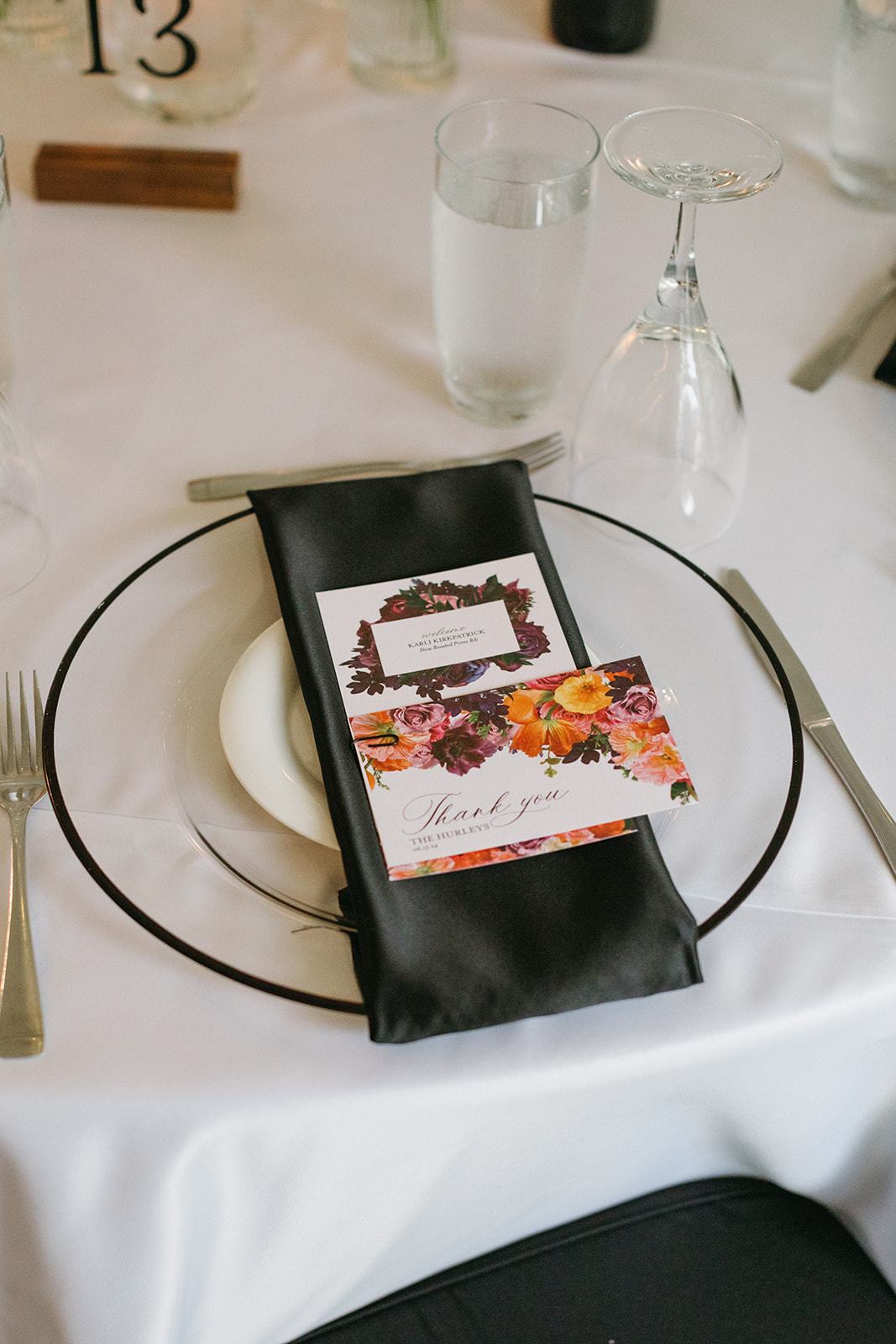 We were so thrilled to design a full wedding invitation suite and day-of signage and table stationery that matched the energy of this wedding: bold florals, rich colour, and a warmth that carried through every single piece. Their wedding invitation suite was a three-piece design anchored in those signature blooms, a nod to the florals that would fill every corner of their celebration at Pineridge Hollow. Day-of, the stationery story continued with a full lineup of acrylic signage: a welcome sign, seating chart, bar signs, and table numbers that brought cohesion to the venue and kept things feeling intentional throughout the evening. The menus were one of those details guests actually noticed. Each one was personalized with guest names, and the floral details were colour-coded by meal selection, a thoughtful touch that made service seamless for the catering team and felt elegant to every person seated.
