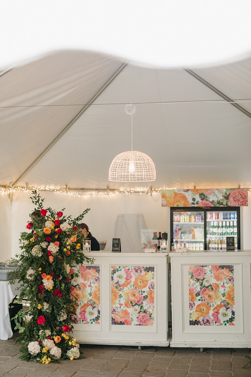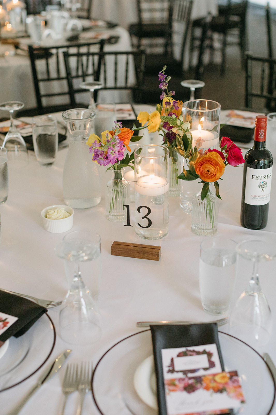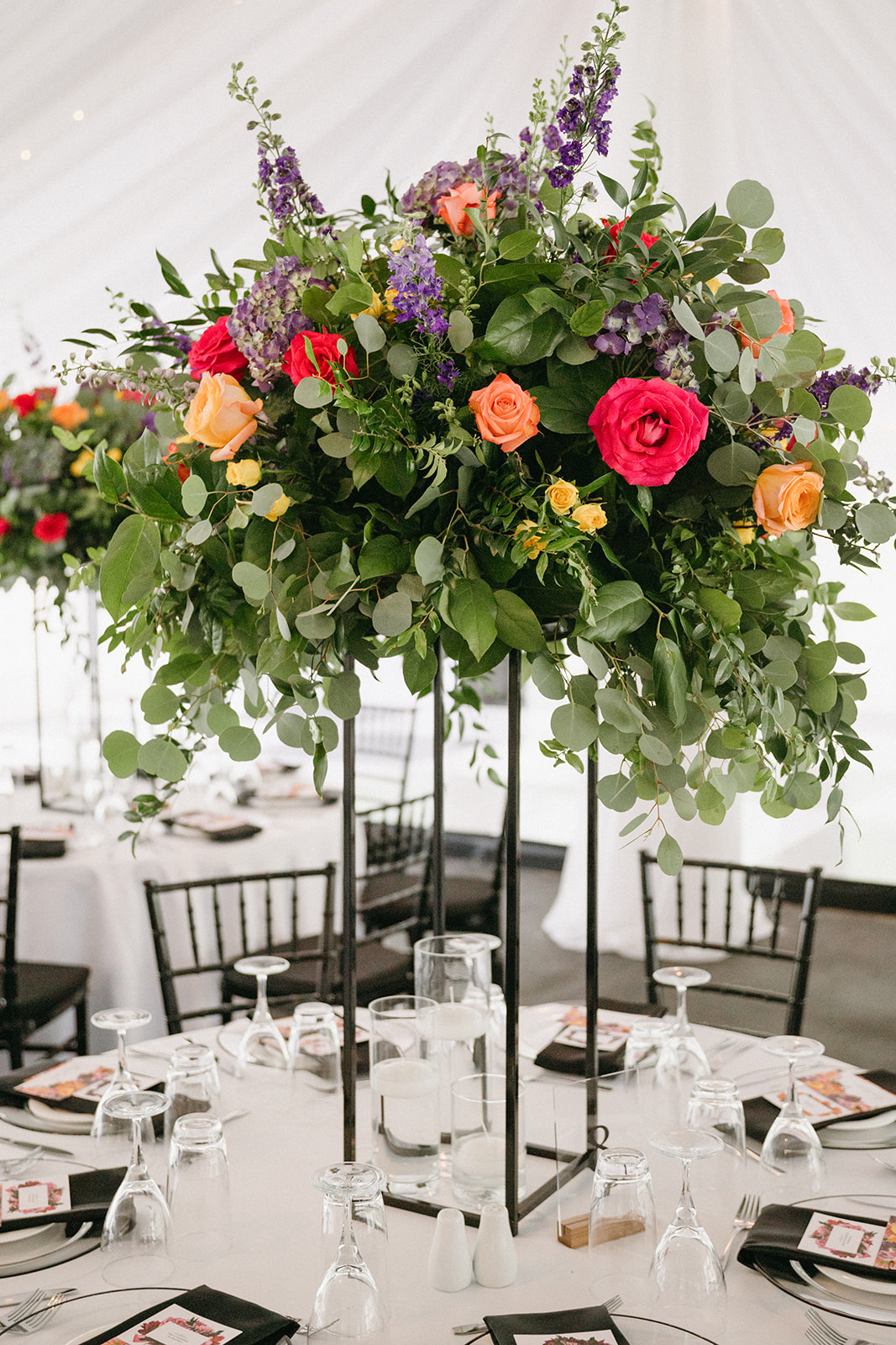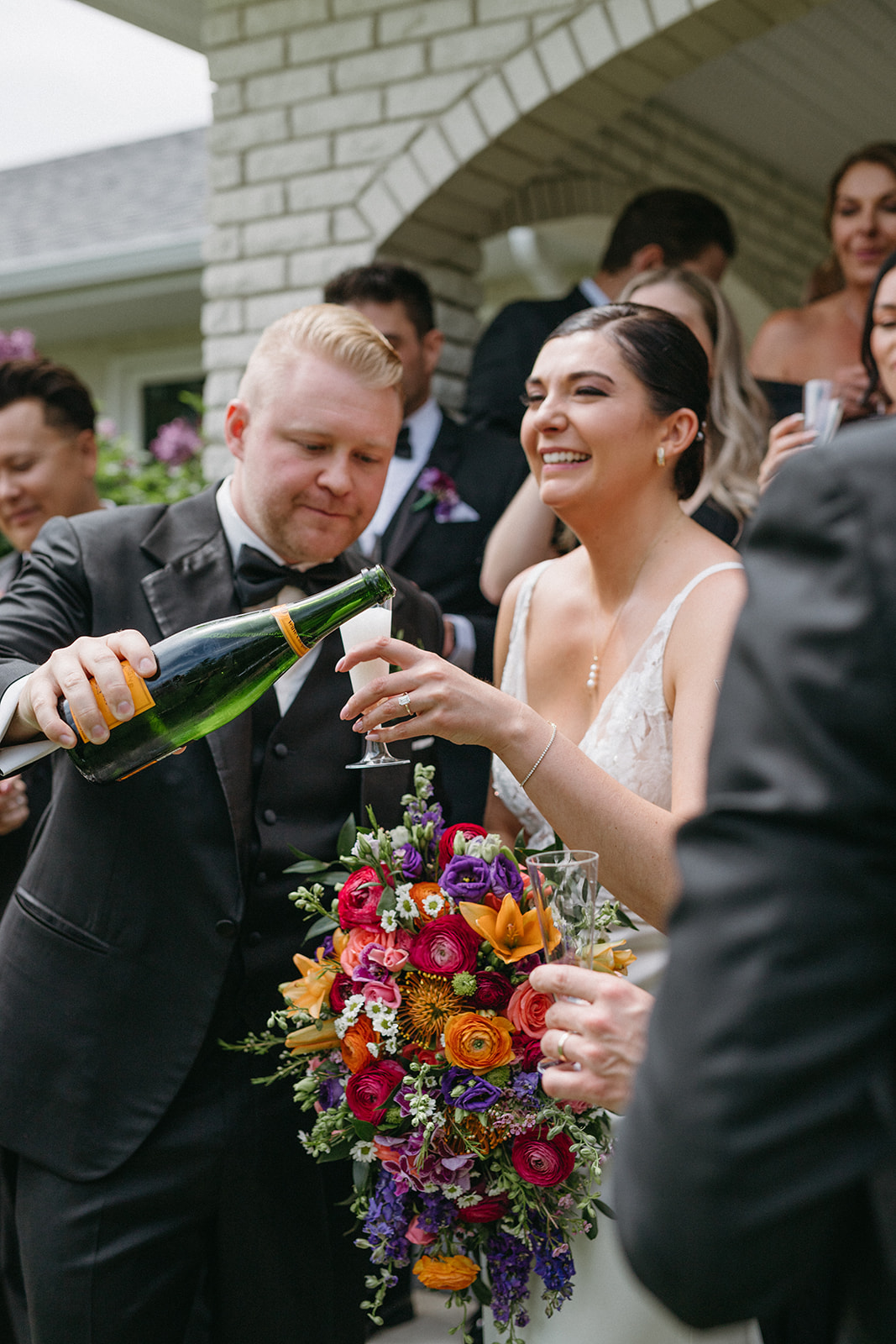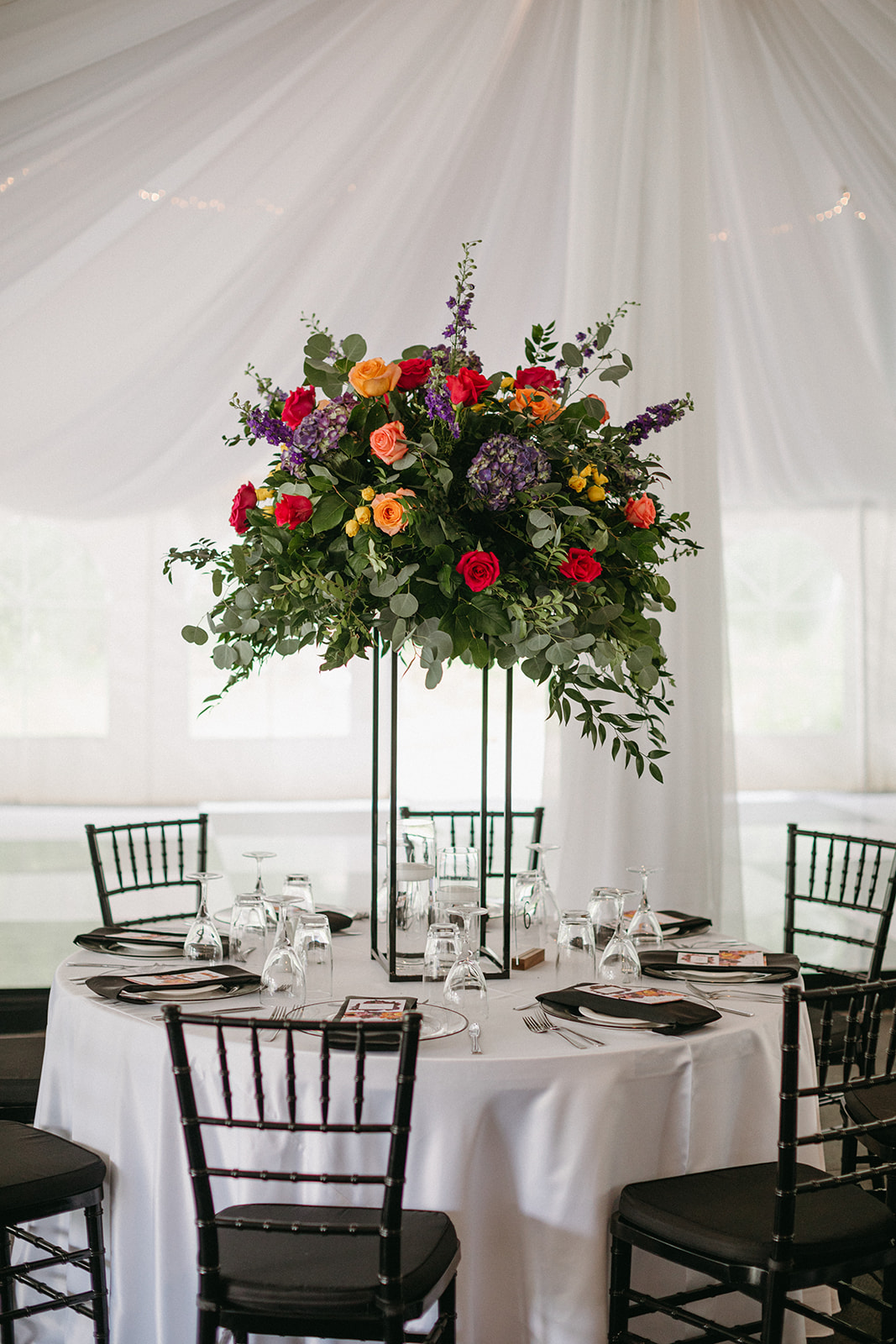 We were so thrilled to design a full wedding invitation suite and day-of signage and table stationery that matched the energy of this wedding: bold florals, rich colour, and a warmth that carried through every single piece. Their wedding invitation suite was a three-piece design anchored in those signature blooms, a nod to the florals that would fill every corner of their celebration at Pineridge Hollow. Day-of, the stationery story continued with a full lineup of acrylic signage: a welcome sign, seating chart, bar signs, and table numbers that brought cohesion to the venue and kept things feeling intentional throughout the evening. The menus were one of those details guests actually noticed. Each one was personalized with guest names, and the floral details were colour-coded by meal selection, a thoughtful touch that made service seamless for the catering team and felt elegant to every person seated.