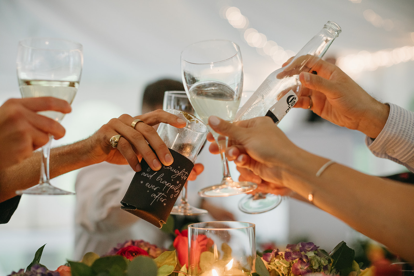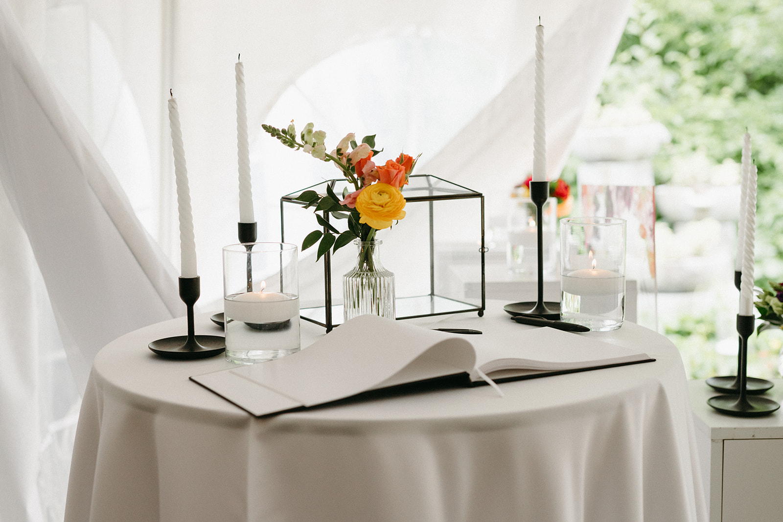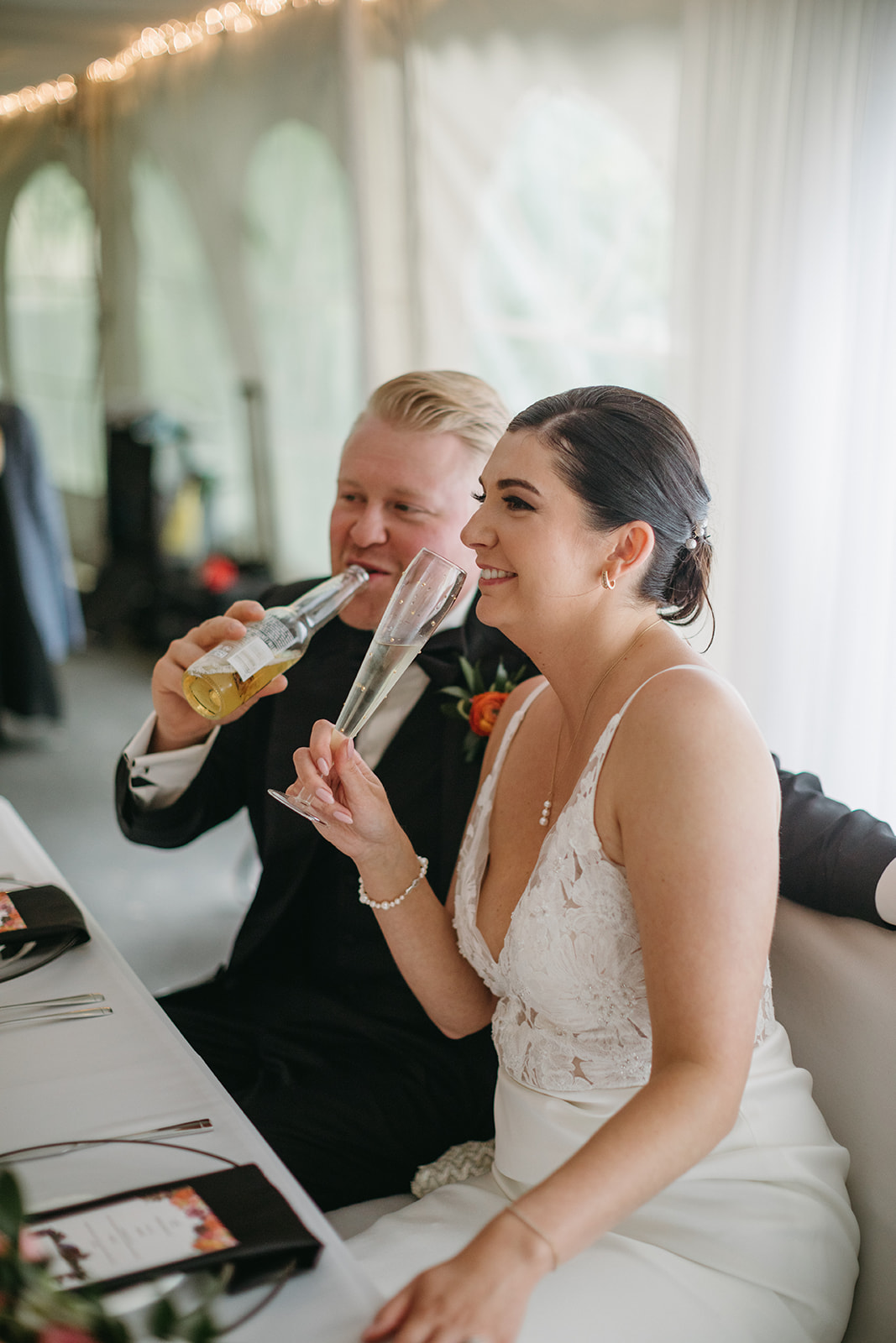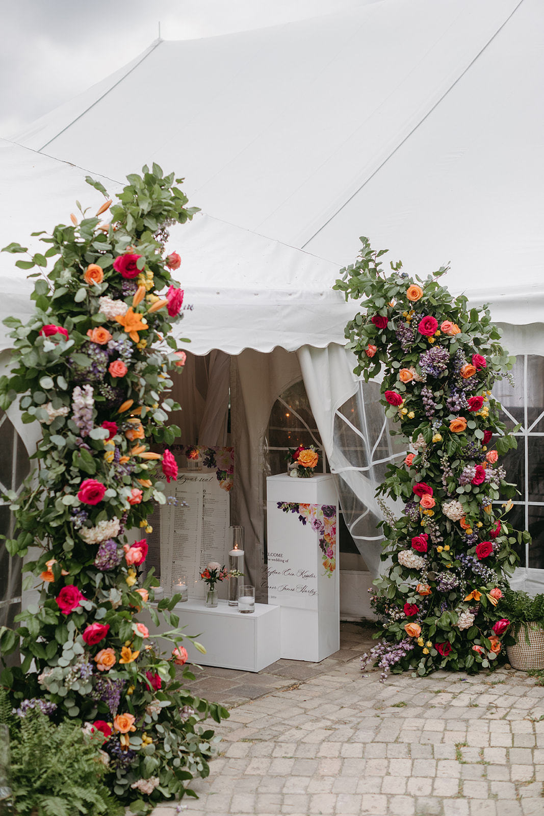 We were so thrilled to design a full wedding invitation suite and day-of signage and table stationery that matched the energy of this wedding: bold florals, rich colour, and a warmth that carried through every single piece. Their wedding invitation suite was a three-piece design anchored in those signature blooms, a nod to the florals that would fill every corner of their celebration at Pineridge Hollow. Day-of, the stationery story continued with a full lineup of acrylic signage: a welcome sign, seating chart, bar signs, and table numbers that brought cohesion to the venue and kept things feeling intentional throughout the evening. The menus were one of those details guests actually noticed. Each one was personalized with guest names, and the floral details were colour-coded by meal selection, a thoughtful touch that made service seamless for the catering team and felt elegant to every person seated.