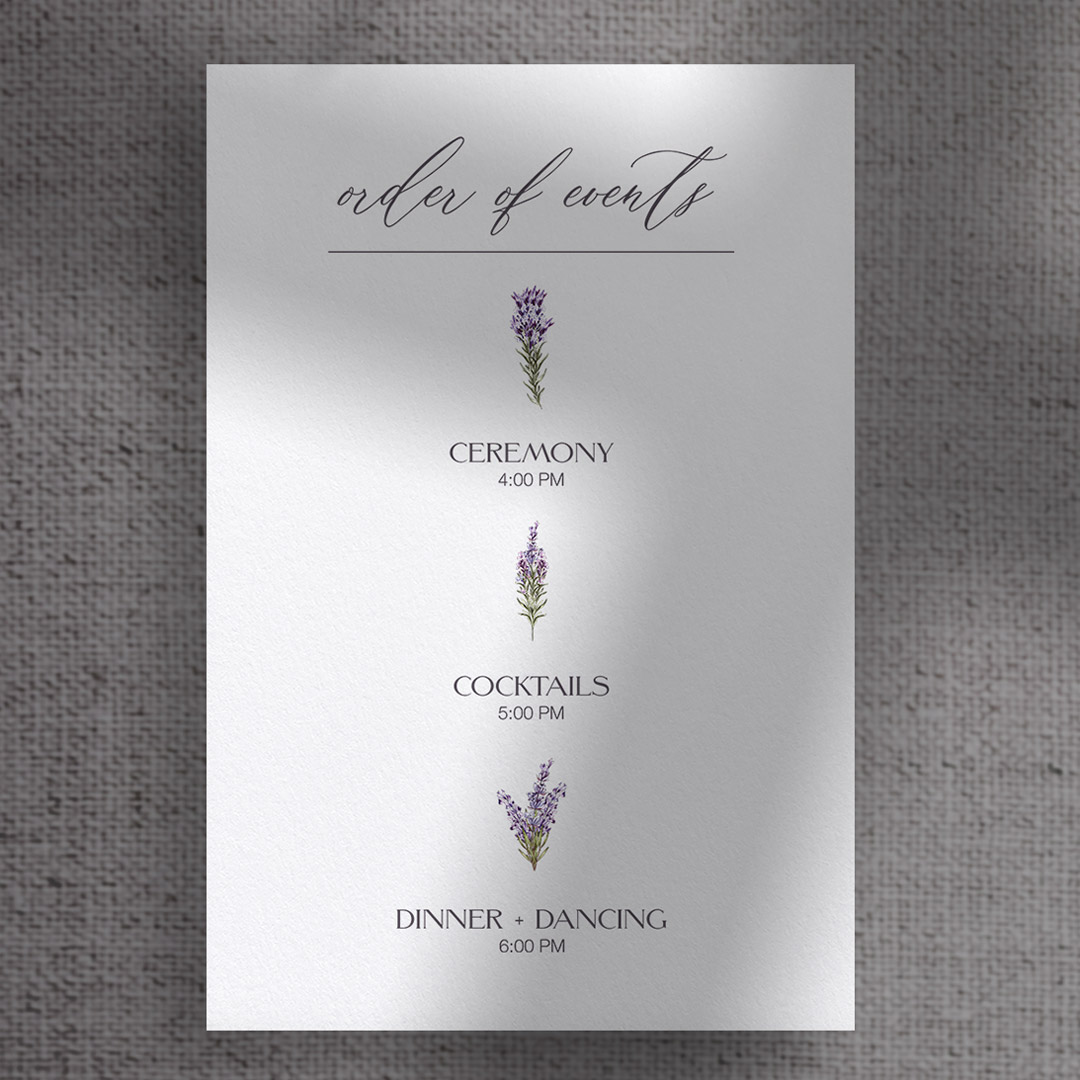 Delicate and lush, the Aria collection features hand-painted watercolor lavender graphics that come together to form a dreamy, overgrown effect. With intricate bunches framing the monogram and soft clusters in the corners, this design feels both romantic and effortlessly organic—perfect for couples who want their stationery to feel like a work of art.