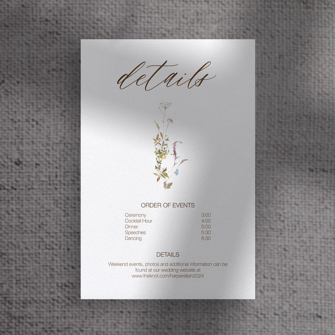 Muted tones of brown and pink set the stage for the Harp collection, a more structured take on watercolor florals. With soft, painterly crests and minimal, thoughtfully placed blooms, this design is delicate yet refined—ideal for couples who love understated elegance with a touch of tradition.