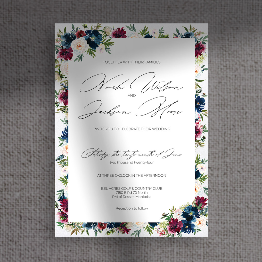 For a timeless and traditional vibe, the Noah collection pairs navy and burgundy watercolor florals with a classic layout. This design speaks to couples who love bold, rich colors and an elegant, formal touch for their stationery.