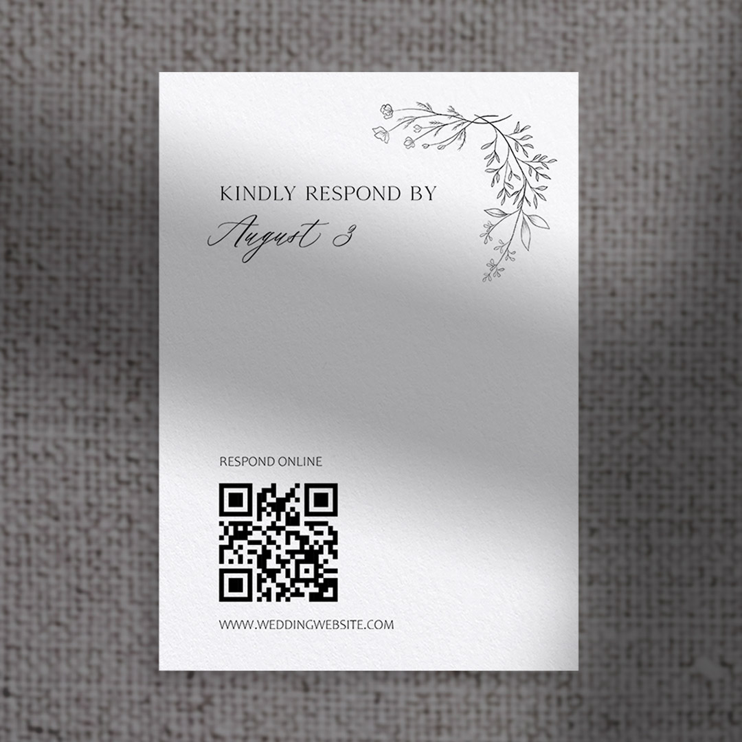 This RSVP card is designed with a digital response in mind such as directing your guests to your wedding website or response via email. These can be upgraded to traditional mail-back cards as well!