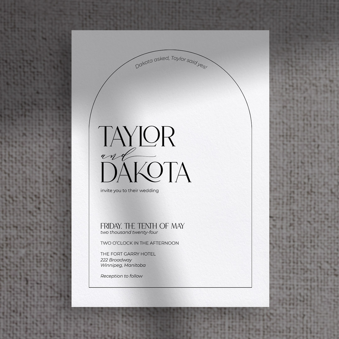 Clean, modern, and architectural, the Tay collection highlights minimalist typography with subtle arch details. Perfect for couples who appreciate thoughtful design and want their stationery to feel sleek and contemporary.